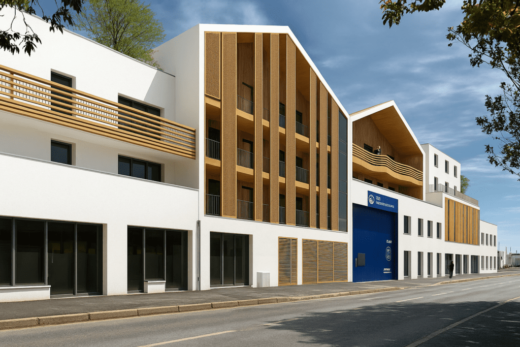 Son architecture contemporaine affirme une identité forte et élégante : volumes rythmés, alternance d’enduits clairs et de bardages bois, loggias protégées, attiques travaillés et toitures partiellement végétalisées. L’ensemble est conçu pour offrir luminosité, intimité et qualité de vie, tout en respectant les exigences actuelles en matière de performance énergétique et de confort thermique.